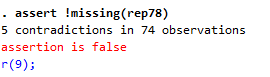The command encountered a false assertion: variable rep78 is never missing. assert provides a count of the contradictions when an assertion is false. In this example, there are 5 contradictions. There are actually 5 missing values out of 74 observations. It also issued an error message with a return code of 9. The output from the false assertion is helpful, as it requires you to review the output to spot the error.