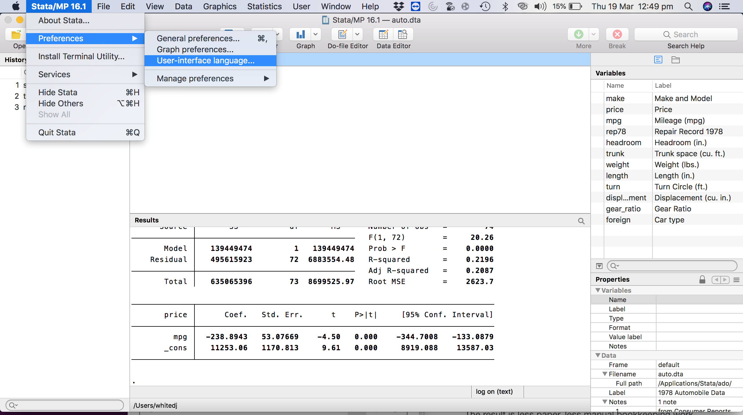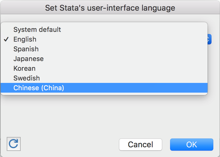 Similar to using Windows or Unix, you may select your preferred language as your interface language. For example, if you choose Chinese (China), the language will be changed to Chinese, Again, you will need to restart Stata to make this change effective.