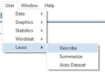 Stata’s menu system groups statistical and graphic commands into sections. While these groupings make sense, it can mean that you are moving between a lot of different menus to perform different statistical and graphic commands for your analysis. If you have a set of statistical and graphic commands you use regularly, you can create your own user menu to group these in one place. The commands to create your menu must be placed in your “profile.do” file in your “User” directory (e.g. mine is saved in C:\Users\LauraWhiting). If you do not already have a profile.do in this location you can easily create one in Stata by opening a new do-file and saving it as profile.do in the correct location. A personal user menu means you only ever have to go to one place to perform your analysis.