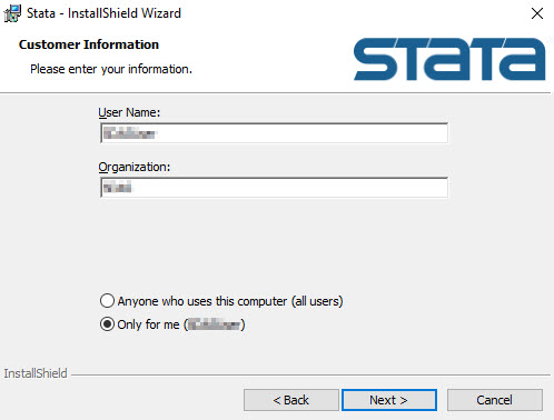 3. Put the user name and organisation as required. NOTE: if it is a single-user licence, you will need to click on ‘Only for me’. Then click ‘Next’: