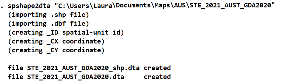 You will see from this that two Stata datasets are created. Make sure these always stay in the same folder together (if you move one you need to move both). The file you want to use is the regular file, in this case “STE_2021_AUST_GDA2020.dta”. DO NOT touch the file with “_shp.dta” on the end. This is what creates the map, any alterations will mean the map cannot be drawn.