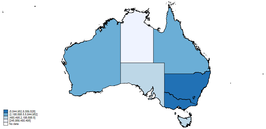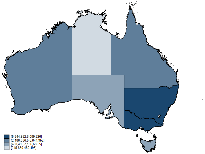 Now this map looks pretty good. However, if you are familiar with the population sizes for states and territories in Australia you may have noticed a problem with this map. The Australian Capital Territory (ACT), the small territory located entirely within New South Wales (NSW), has a population close to that of Tasmania (TAS). The ACT should be coloured a light blue, the same as TAS (the island below the rest of the country). But in this map it’s colour is the same as NSW.