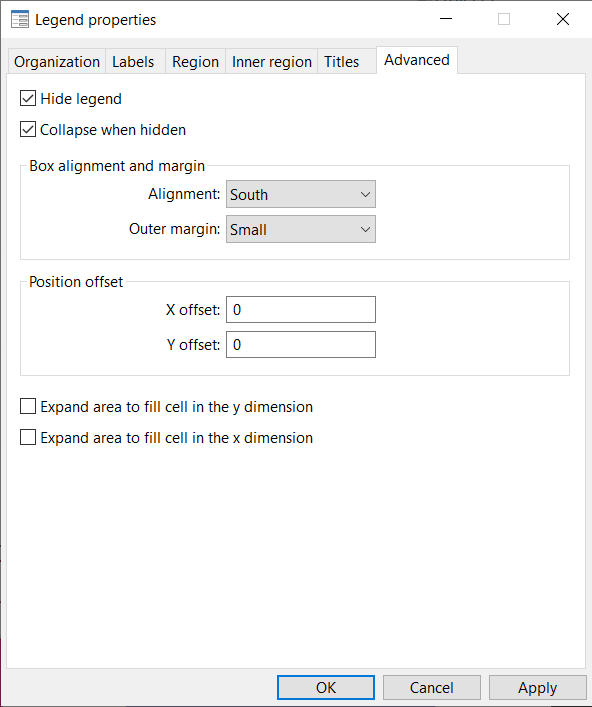 I want to remove the legend, as my icons are going to provide this information. I double-click on the “legend” object in the right-side menu and a pop-up box appears. I select the “Advanced” tab of the box and tick the “Hide legend” tick box. I click OK to apply the change.