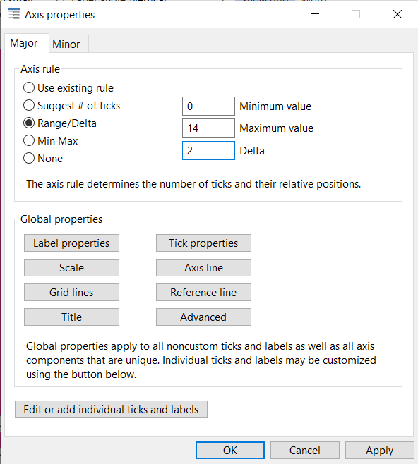 I want to add my icons to the top of each bar, however there is currently not enough room above the lavender bar. To fix this I am going to extend the Y-axis range from 10 to 14. I double-click on “scaleaxis” in the right-side menu. At the top under “Axis rule” I select “Range/Delta” and I input 0 into the “Minimum” box, 14 into the “Maximum” box, and 2 into the “Delta” box. I click OK to apply.