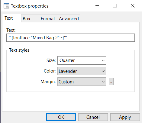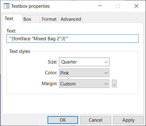 This allows me to add text boxes. I click on the space above the pink bar to add my first icon. I fill out the text box as you can see below, with the following macro: