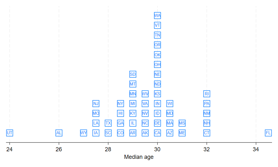 stripplot medage, stack msymbol(square_hollow) msize(*3.5) width(0.5) mlabel(abbrev) mlabpos(0) mlabsize(*.9) yscale(off)