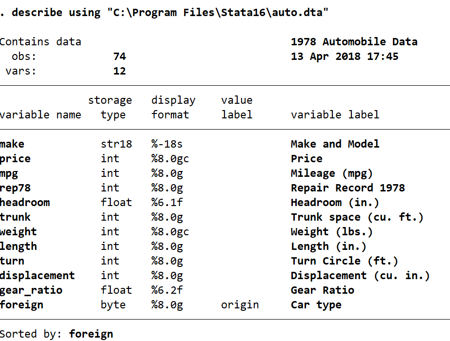 describe using "C:\Users\Laura\Desktop\auto.dta"