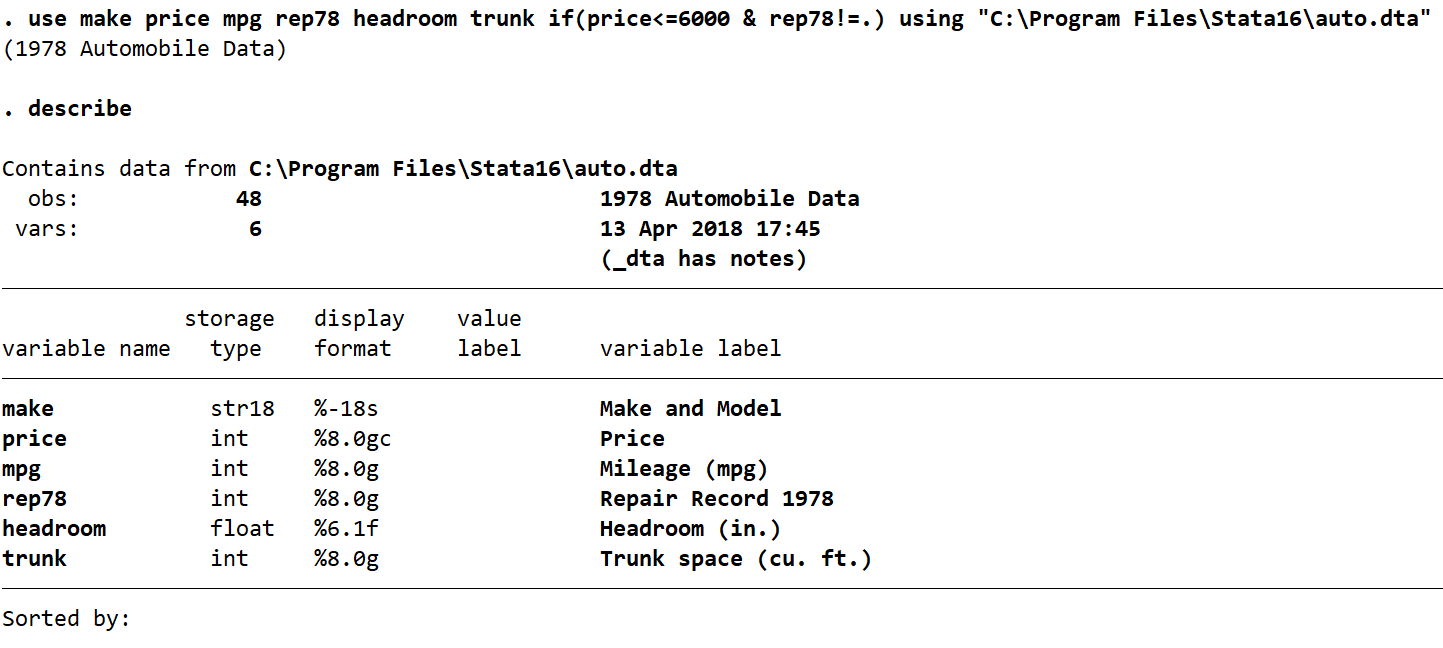 As you can see, the six variables have been brought in, but observations where rep78 is missing or price is greater than 6000 have been left out (not imported). I have done this with one command, without ever loading the full dataset in memory. This is a great tool when you are looking at a really big dataset (e.g. HILDA) and you are only interested in a smaller subset of the data contained in the file. Even if your Stata is unable to load the full dataset, you can still see whats inside it with describe and pull in the bits you need with use.