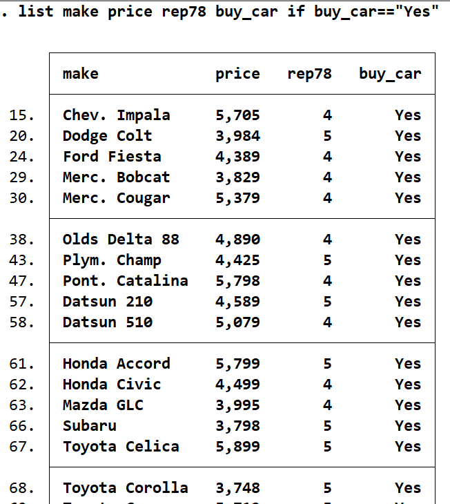 generate buy_car=cond(price<=6000 & rep78>3 & rep78!=.,"Yes","No")