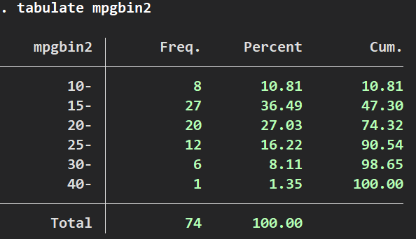 In the previous example I separated mpg into four separate ranges (10-19, 20-29, 30-39, 40-49), which are saved in the new variable mpgbin. However, by looking at the table generated by tabulate I discovered that there are many more cars with an mpg in the 10-29 range than in the 30-49 range. Now I want to further separate the lower mpg values into groups of 5, while keeping the higher mpg values in groups of 10. To do this I have to be a bit more specific about the ranges I use in my egen command. In the command pane I type the following: