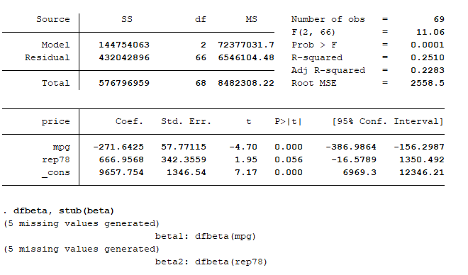 The dfbeta command has generated beta values for each observation for mpg (beta1) and rep78 (beta2). The 5 missing values are generated because in the rep78 variable there are 5 observations with a missing rep78 value. Stata excludes observations with missing values when generating a regression model.