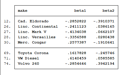 list make beta* if abs(beta1) > 0.241 & rep78 != . | abs(beta2) > 0.241 & rep78 != .