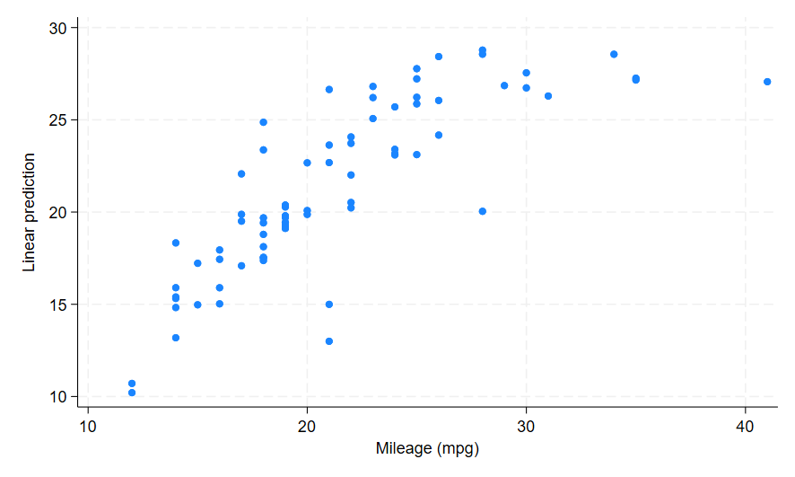 Also note the predict command has added the label Linear prediction to my mpg_fitted variable, which is visible along the x-axis. If you do not want a variable label, you can add the nolabel option along with any of the other predict options and Stata will not add its default label.
