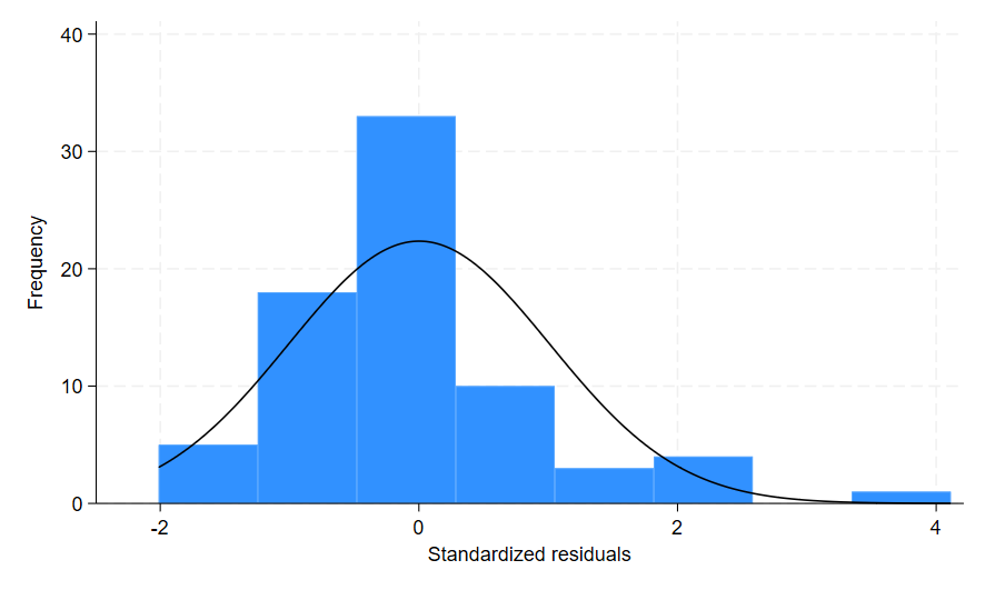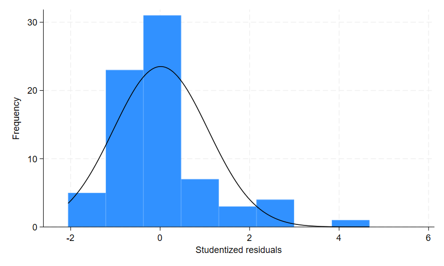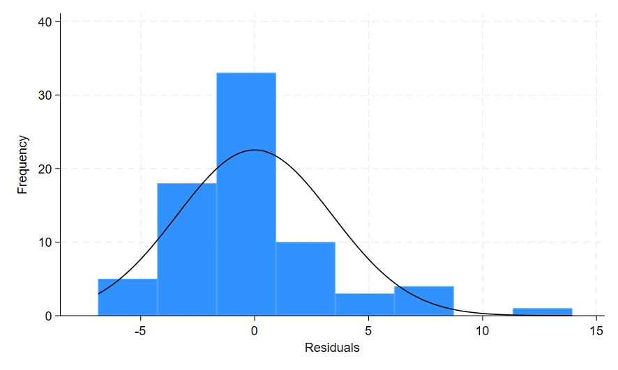 The option residuals added to the predict command generated a new variable resid that contains the residual values for my model. When I ran the histogram command, I added the option frequency because I wanted the count data rather than the density on the y-axis. The normal option added a curve on top of the histogram to represent a normal distribution. This allows me to compare the histogram bars to the normal distribution line to help determine if my residuals are normally distributed.