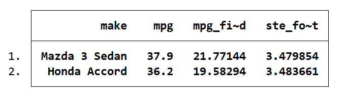 list make mpg mpg_fitted ste_forecast
