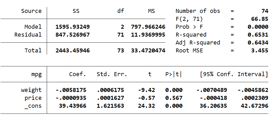 regress mpg weight price