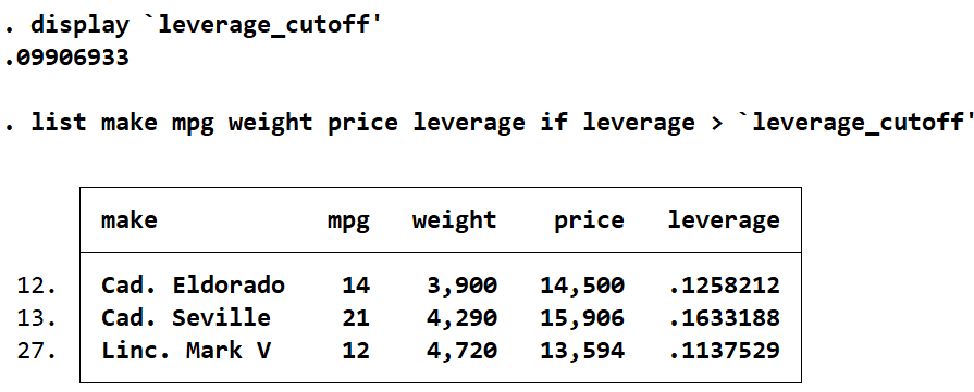 list make mpg weight price leverage if leverage > `leverage_cutoff'
