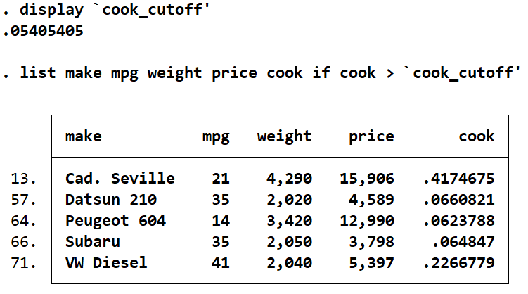 list make mpg weight price dfits if dfits > `dfit_cutoff'