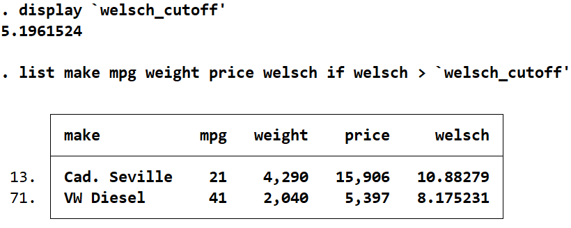 list make mpg weight price welsch if welsch > `welsch_cutoff'