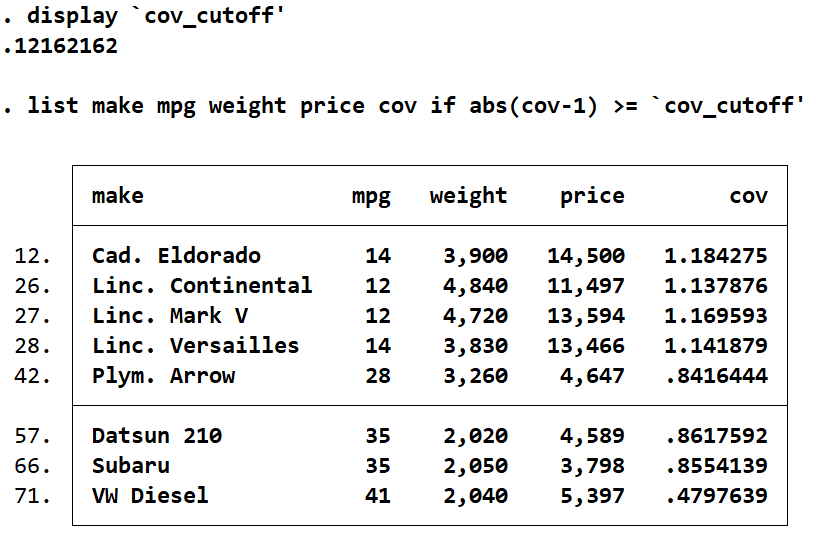 list make mpg weight price cov if abs(cov-1) >= `cov_cutoff'