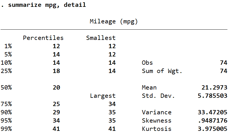 For this example I am going to recode the variable mpg. My new variable will categorise mileage on a scale from 1 (poor/inefficient) to 5 (excellent/very efficient), in the same vein as the rep78 variable. In the command pane: