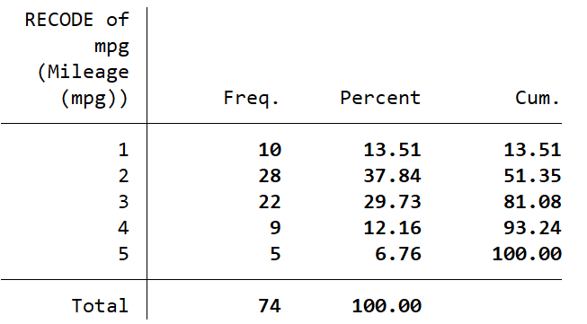 recode mpg (12/15 = 1) (16/20 = 2) (21/25 = 3) (26/30 = 4) (31/41 = 5), generate(new_mpg)