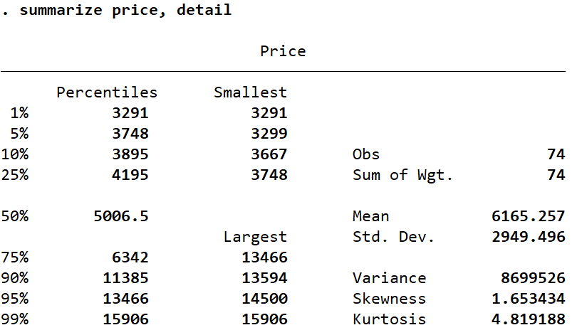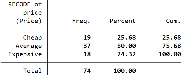 Our variable has been successfully recoded. I used the macros generated by the summarize command to separate the price of cars into three distinct categories.