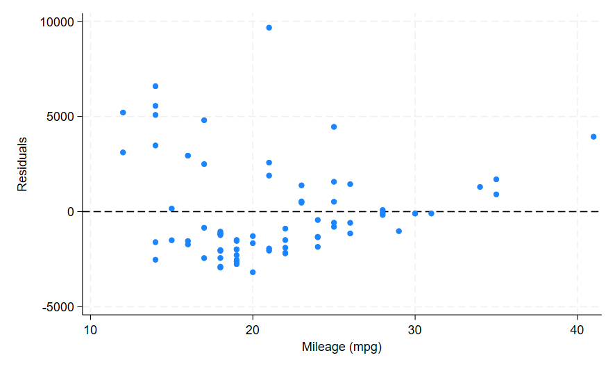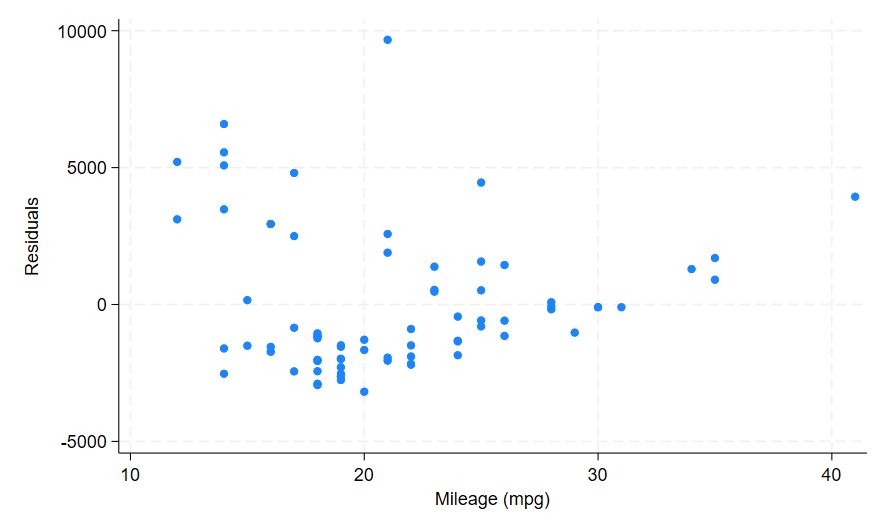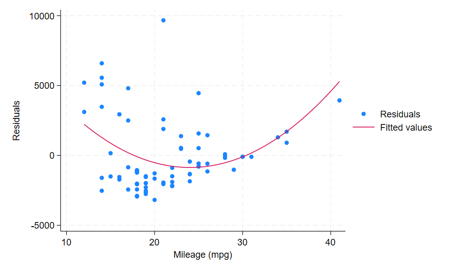 This prediction fits quite well, indicating that there are some issues with our independent variable mpg. There are many other tests you can use to investigate what might be causing this problem. There could be a problem with the relationship between variables. To test this for a linear regression with only one independent variable, you simply plot the two variables against each other to see if there is a linear relationship. For a regression with multiple independent variables you need to use the avplot command instead. There may also be issues with heteroskedasticity, which you can check with the commands estat hettest, estat szroeter, and estat imtest, as well as plotting the residuals against the fitted values using predict and the histogram command. Finally, non-linearity can also be an issue. You can investigate non-linearity with estat ovtest and rvfplot.