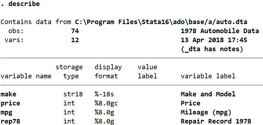 You can see by comparing the describe and list outputs with each other the changes that have occurred. In the first describe the order of variables is “make price rep78 mpg”, and in the second it has changed to “make rep78 price mpg”. This change is due to the order command. In the first list we see the observations appear ordered alphabetically based on the “make” variable. In the second list the order of observations has changed to be in order of “rep78” values (from 1 to 5), with observations further ordered alphabetically by “make” within each category of “rep78”. So now the cars with a repair record of 1 all appear at the top, and they are all in alphabetical order.
