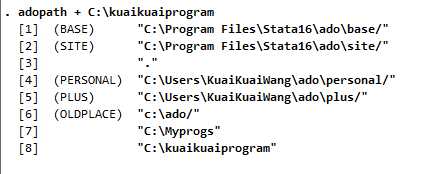 adopath can also change the contents of the path. In general, you should not do this unless you are sure of what you are doing because many features of Stata will stop working if you change the path incorrectly. The path may include actual directory names, such as C:\kuaikuaiprogram, or codewords, such as PERSONAL, PLUS and OLDPLACE. To add C:\kuaikuaiprogram to the end of the path, type: