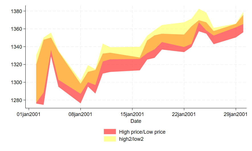 twoway (rarea high low date, fcolor(red%70) lcolor(none%0)) (rarea high2 low2 date, fcolor(yellow%50) lcolor(none%0)) in 1/20, legend(position(6))